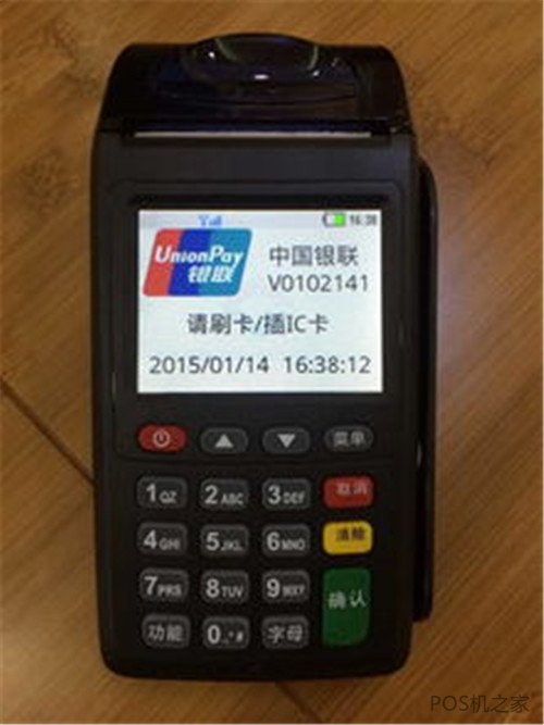 1、准备一台喔刷pos机,长按红色开关键打开pos机。
